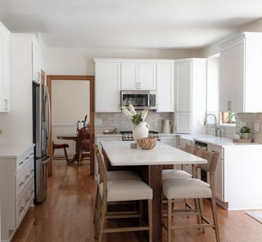 The homeowners of this house were ready to breathe new life into their space starting in their kitchen and primary bathroom. Having lived in the home for several years, they grew tired of the dated wood cabinets. The end goal was to update their space not only for themselves, but for future resale value. We wanted to ensure we were selecting finishes that potential buyers would also enjoy!