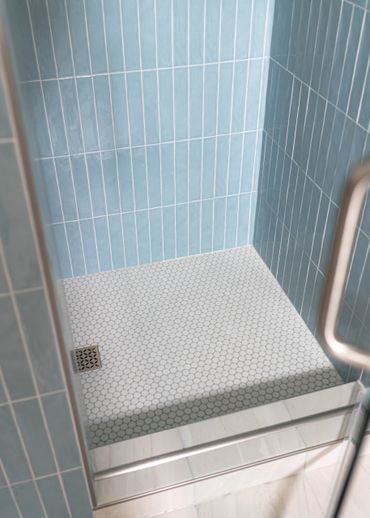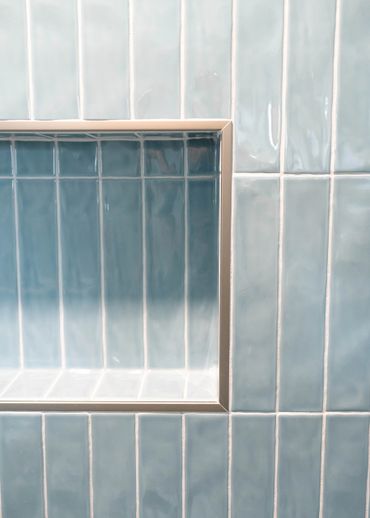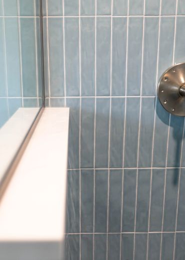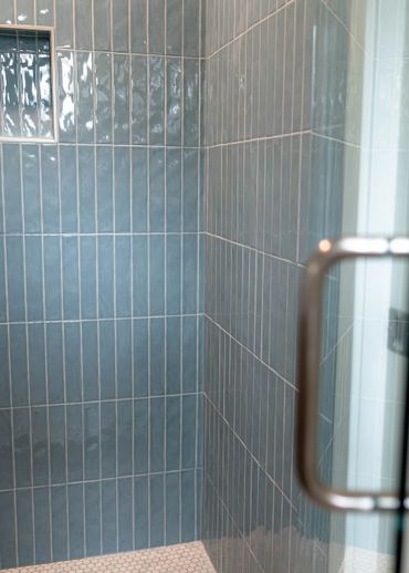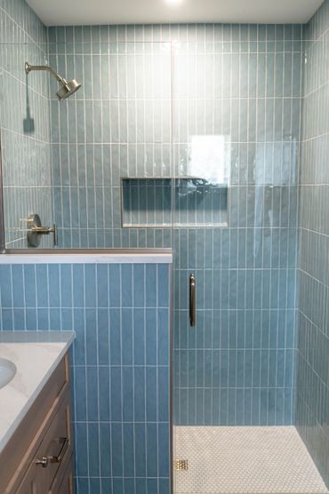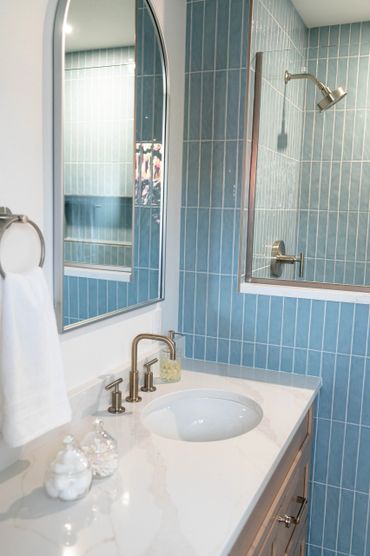 Our client was eager to transform their builder-grade bathroom into the ensuite of their dreams. The primary goal was to increase storage and really brighten up the space. We incorporated light wood cabinets and blue tile to add a serene and modern touch, perfectly balancing functionality with a calming aesthetic.